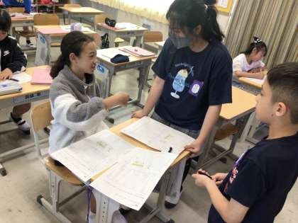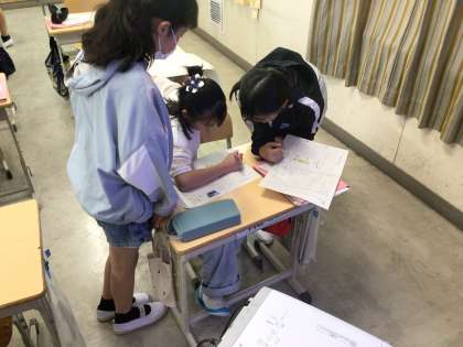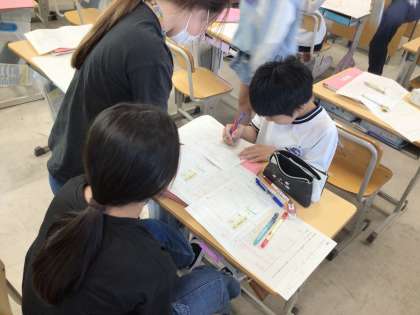 国語の学習で、自分の国の魅力を発信する記事を書きます。まずはモデル文から、わかりやすく伝えるためのコツを探していきます。みんな素敵な記事にするために、一生懸命モデル文を読み、コツを見つけています。