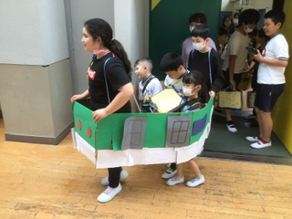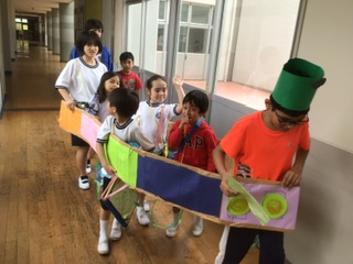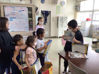 まずは体育館に集合して、6年生が作った特別列車に乗り込みます。さあ、学校探検に出発です。保健室や家庭科室、図書室などを回ります。それぞれの場所で、6年生からクイズが出題です。1年生は答えられるでしょうか。