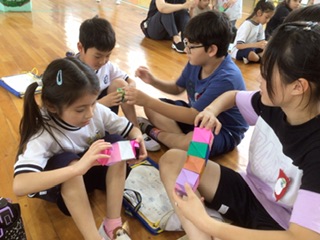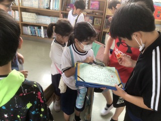クイズに答えたら、カードにスタンプを押してもらえます。最後は折り紙のおもちゃをプレゼント。みんな笑顔です。こんなに楽しい探検を企画・準備した6年生、さすがです。