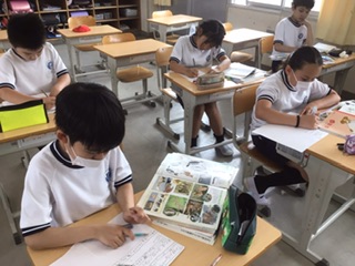自分で選んだ生き物について本で調べ、絵と文章でまとめています。コアラ、ペンギン、マグロ、チンアナゴ… いろいろな生き物の図鑑ができています。