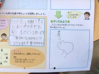 愛知県の紹介文を考えていました。形を説明するのに「カニに似ている」「ひよこみたいだよ」と、イメージを膨らませていました。