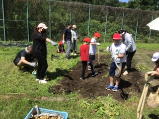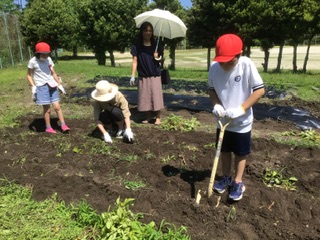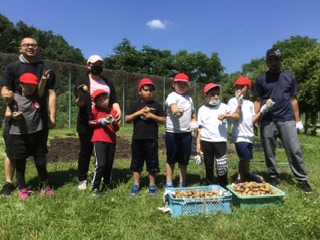 お家の方と協力して、学級園のじゃがいもの収穫をしました。少し掘ると、大きなじゃがいもが次々と姿をあらわします。大豊作です。