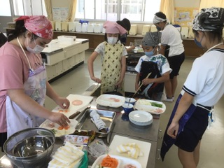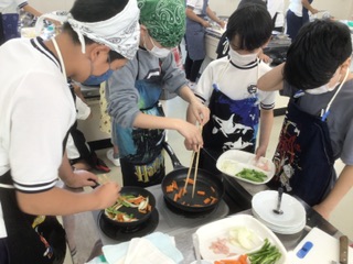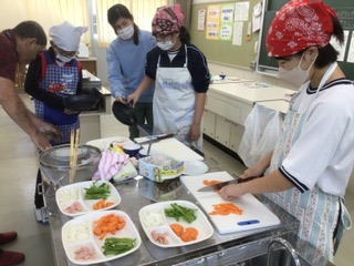 「いろどりいため」に挑戦です。切るのが難しいにんじんや玉ねぎですが、慎重に切っていきます。でも、見ているお家の方はちょっと心配そう。家庭科室に野菜炒めの良い香りが漂っています。