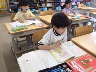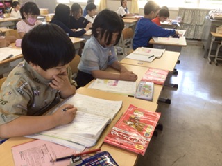 書いてある場所や時間、出てくる登場人物をヒントにして、物語文の場面分けを行いました。お話を真剣に読んで、考えています。