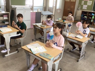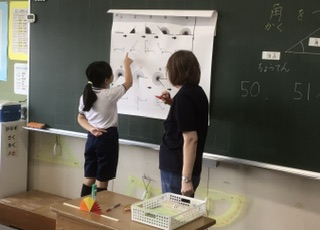 折り紙と割りばしを使って、360度開く扇を作りました。その扇を使って、角度の勉強が始まりました。