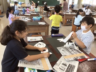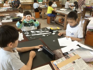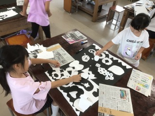 白い画用紙を、はさみで自由に切り取りました。いろいろな形ができました。今日はそれを黒い画用紙の上に並べて、作品作りです。どんなアートが完成するのでしょうか。