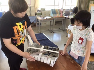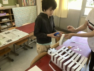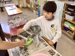 今年も大きなお面づくりに取り組みます。自分でデザイン画を描いて、それに合わせて、画用紙で骨組みを作り、小さく切った新聞紙を貼り付けていきます。先生と相談しながら進めていきます。