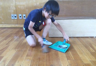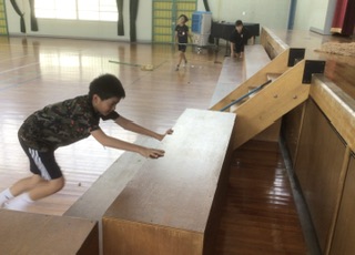 体育館掃除担当の3人。今日は大きなひな壇を全部動かして、下に溜まったゴミをモップできれいにしてくれました。掃除終了のチャイムがなっても、ひな壇を整えるところまで責任をもって行っていました。