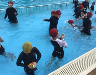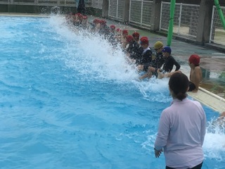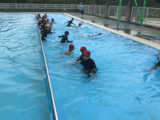 待ちに待ったプール開きです。バタ足練習や、ボール拾いなどをして、水に親しみました。