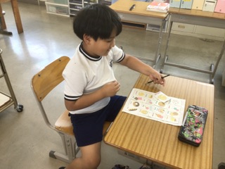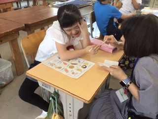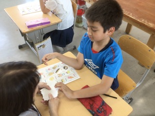 今日の外国語の授業は、食べ物ビンゴです。引いたカードに描いてある食べ物の呼び方を英語で確認した後、ますに丸つけをしていきます。cookie,candyなどの他に、bean daifukuのような和菓子も入った楽しいビンゴになっています。