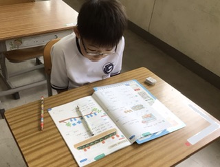 算数の時間です。絵や問題文を読んで、数字を見つけ、あわせていくつになるか考えています。