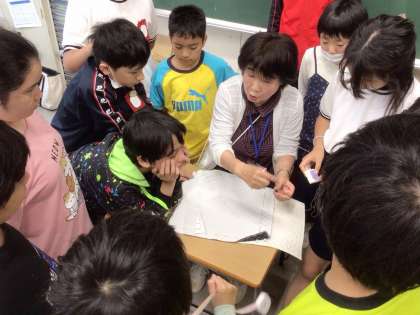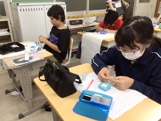 布に印をつけて、今日は仮縫いをします。まず針に糸を通すのに一苦労です。どの部分をどのように縫うのか、先生の説明を真剣に聞いています。