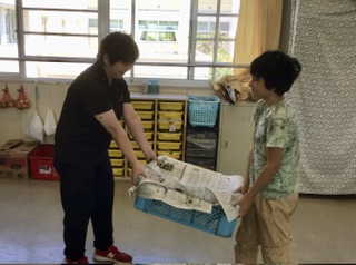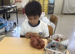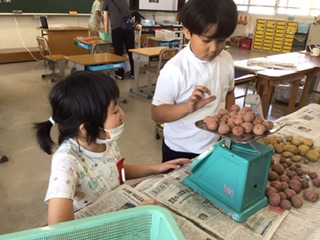 販売するために、収穫した夏野菜を計って袋詰めしていきます。みんな同じ量になるように、気をつけています。