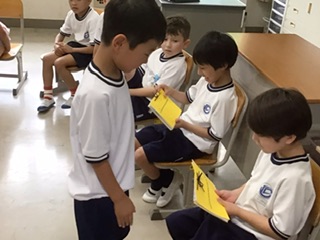 もうすぐ転校してしまうお友だちと一緒に、お別れ会をしました。みんなとっても楽しそうです。最後にはお手紙のプレゼントです。新しい学校でも、たくさんの友だちができると良いですね。