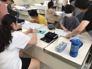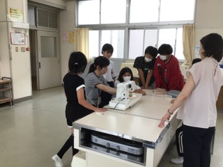 ミシン実習が始まりました。授業ボランティアさんにも手伝ってもらい、ナップサックを作成中です。