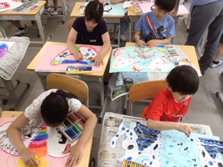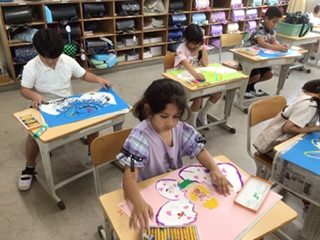 自分だけの「ふしぎなたまご」。 割ったら何が生まれてくるのか、想像を広げて画用紙に描き込んでいます。