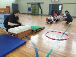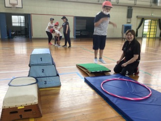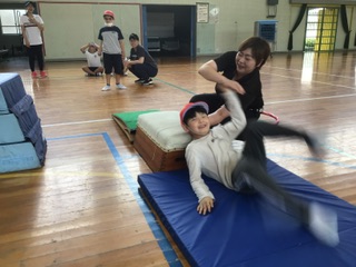 いつものようにサーキットトレーニングをした後、今日は跳び箱運動に挑戦しました。踏み切り板を使ったジャンプの練習をしてから、まずは一段から。みんな頑張っています。
