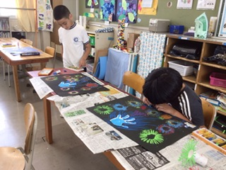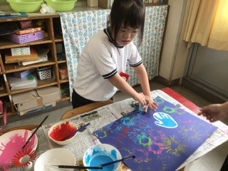 絵の具とクレヨンを使って、夏をイメージした作品を作りました。色とりどりの花火が、画用紙いっぱいに輝いています。