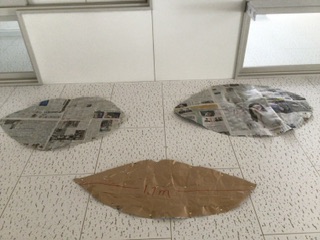 6年生教室前の廊下、天井に巨大な手や足跡が出現しました。顔らしきものもあります。実は、これは奈良の大仏の実物大の手形や足型です。6年生が協力して作りました。なかなかの大きさです。修学旅行で実物を見るのが楽しみです。