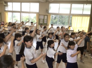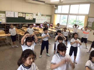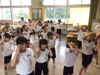今日も気温が高かったので、体育は冷房の効いた教室でダンスです。みんな映像を見ながら、リズムに乗って踊っています。