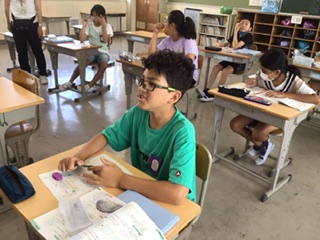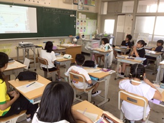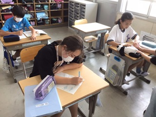 算数では図形の学習を進めています。今日は三角形の「内角の和」を使って、問題の図形の角度を考えています。なかなか難しいです。