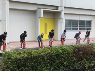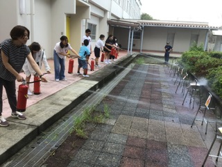 5、6年生は水消火器体験です。火を見つけたら、大きな声で「火事だ!」と叫んでから消火器を操作します。みんな上手に的に水を当てていました。