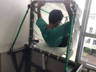 総合的な学習で防災に取り組んでいる5年生は、もう1つ、非常袋体験もしました。3階の窓から下まで、回転しながらするすると降りていきます。