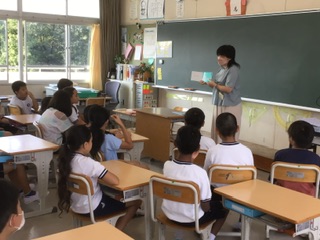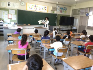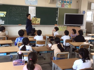 授業開始にあわせて、読み語りもスタートです。ボランティアの方々の語りを、みんな夢中になって聞いています。