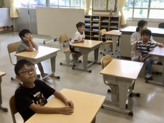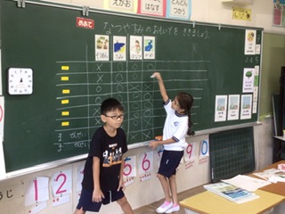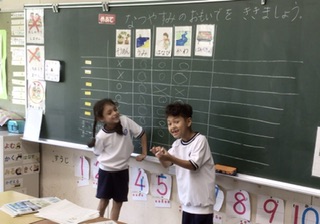 「〇〇さん、夏休みに海に行きましたか」「はい、海に行きました」話型に気をつけながら、夏休みの思い出を友達に聞いています。
