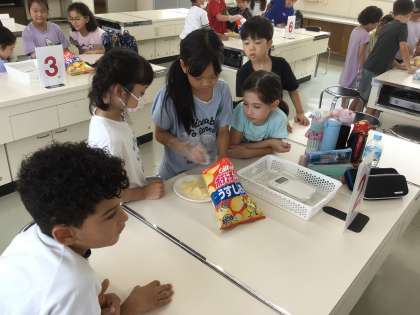 総合的な学習の時間でスナック菓子の食べる量を学びました。1日約200キロカロリー(ポテトチップスなら約35g)のお菓子の量が体にいいと言われています。