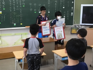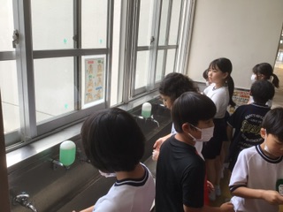 清潔な手で生活できるように、保健委員会の呼びかけで27日まで「手洗いフェスタ」を行います。活動の内容を、保健委員が各学級に知らせに回っています。