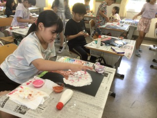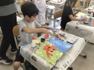 液体粘土をまぜてとろとろにした絵の具を使って、手で画用紙に描いていきます。手触りも楽しみながら、進めています。