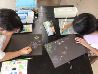 楽しかった夏休みを思い浮かべながら、花火を描いています。大きさや色、筆の使い方などを工夫した、個性あふれる花火がたくさん夜空にあがっています。