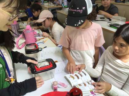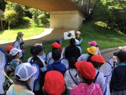 自然観察の森では、実際に生き物を採取し、からだのつくりを学びました。また、標本を使って、昆虫の羽の観察もしました。
