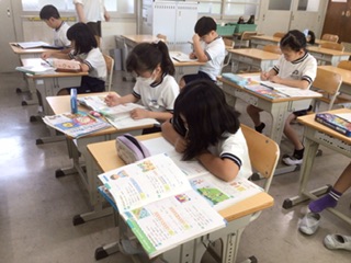 算数の授業です。文章題を読んで、解き方を考えます。増えたり減ったりまとめたり…。なかなか難しいです。