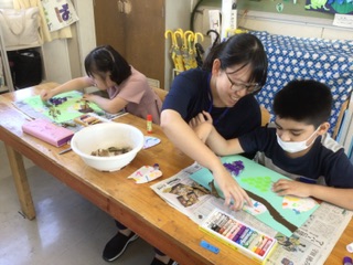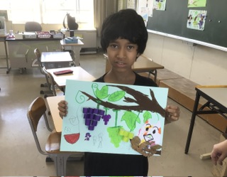 テーマはぶどうとフクロウです。落ち葉を貼り付けたり、フクロウの表情を工夫したりして、素敵な作品ができました。廊下に掲示予定です。