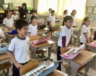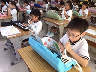 音の高さに気をつけながら、「ひのまる」という曲を歌ったり鍵盤ハーモニカで演奏したりしています。歌うときは良い姿勢で大きな口をあけて、鍵盤ハーモニカで演奏するときはリズムに気をつけて、みんな楽しそうに取り組んでいます。