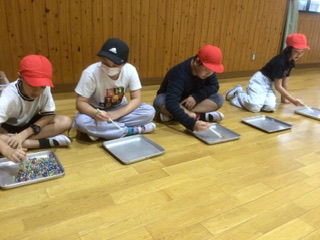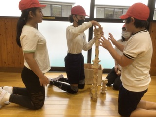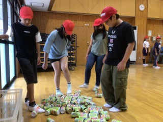 雨でアスレチックができなくなったために、ほおのきホールでちびっ子ギネスに挑戦中。色々なゲームに班で協力して取り組んでいます。新記録は出るでしょうか。