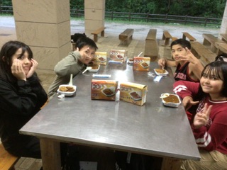 発熱剤を使って食事を温める防災食。中華丼、カレー、牛丼、ビーフシチュー、どれも美味しかったです。次はいよいよキャンプファイヤーです。