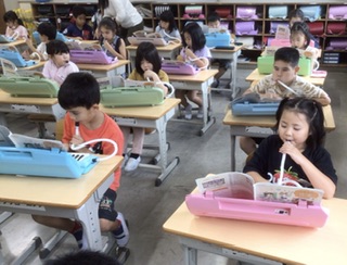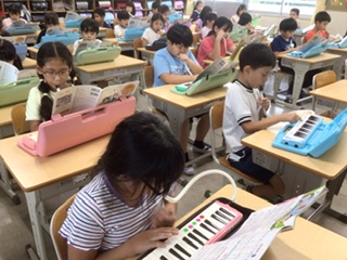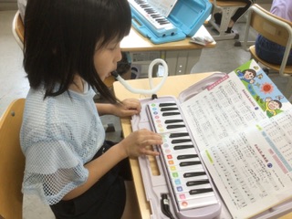 「ドレミであそぼ」や「アイアイ」の曲を、歌ったり鍵盤ハーモニカで演奏したりしました。歌うときは本当に楽しそうです。リズムに合わせて踊りながら歌っています。