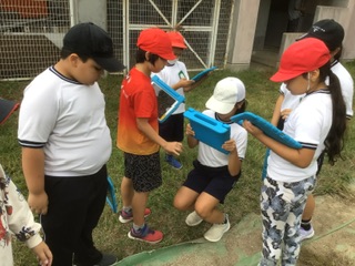 理科の時間、生き物を探しに運動場へ。バッタやてんとう虫、チョウを見つけて、学習用タブレットで記録写真を撮っています。