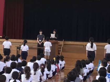 体育館で後期学級委員と後期各委員会委員長の任命式を行いました。さすが、学級委員や委員長に選ばれた代表児童のみなさん、呼ばれると、元気いっぱいの大きな声で返事をしていました。とても頼もしく感じました。