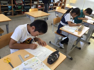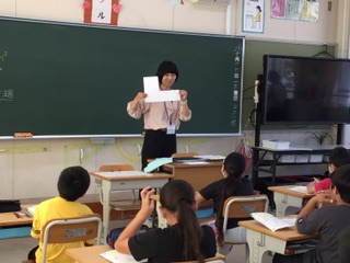 4年生で、教育実習の先生が算数の授業を行いました。長方形,正方形の面積の求め方を使って複雑な形の面積も求めることができました。