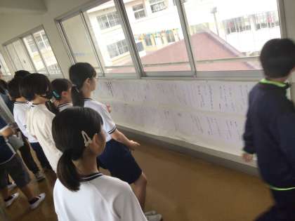 国語で学習したことを活かし、野外学習で心に残ったことを短歌に表しました。3階の渡り廊下に展示し、先生や5年生のみんなで良いと思った短歌に投票をしています。どの作品も素晴らしく、どの短歌に投票しようか迷ってしまいます。
