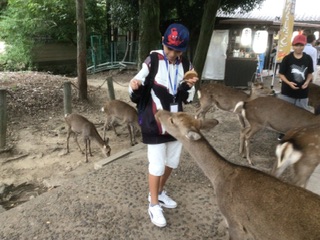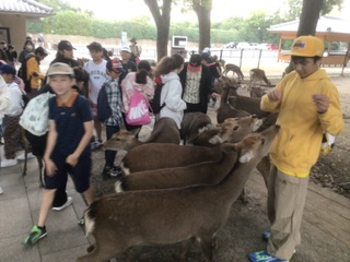修学旅行2日目。みんな元気に活動開始です。宿の近くの猿沢の池で鹿と遭遇。次に訪れた奈良公園では、鹿に囲まれました。