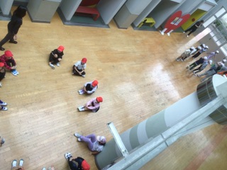 今日は運動場で西保見スポーツデーの練習をする予定でしたが、あいにくの雨。そこでスカイライトホールを使っての練習です。場所は狭いですが、みんな真剣に取り組んでいます。