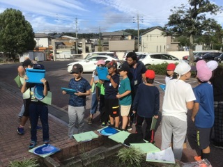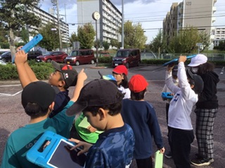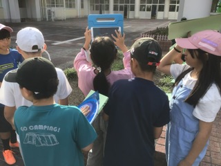 学習用タブレットのアプリを使うと、昼間でも夜空の星を観察することができます。星座盤も使いながら、この時期にはどんな星が出ているのか調べています。
