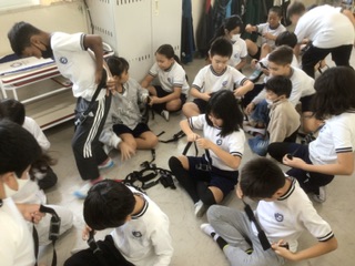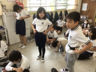 教室で並び方や動きについて確認しています。腰に巻いているのは何でしょうか。当日の競技を楽しみにしていてください。