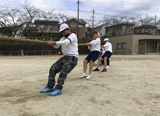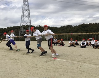 第一陣、第二陣、第三陣と参加人数が増えていく、6年生の綱引き。全力で縄を引く姿に、見ている方も力が入ります。