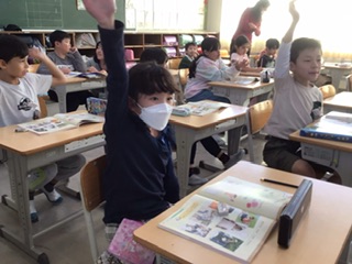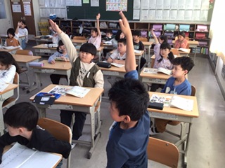 道徳の授業です。友達が悲しくなってしまう「チクチクことば」、友達を嬉しい気持ちにできる「ふわふわことば」について考えました。たくさんの子が活発に意見発表をしています。